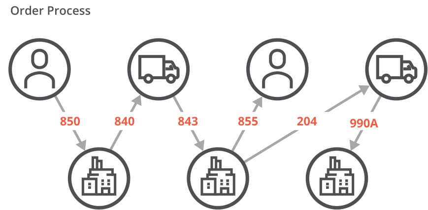 Suppose a retailer sends an 850 (Purchase Order) to a supplier. The supplier then provides an 840 (Request for Quotation) to the shipping carrier. The carrier responds by sending an 843 (Response to Request for Quotation), which includes a price quote to the supplier. The supplier responds with an 855 to the retailer, to acknowledge the Purchase Order and confirm the shipping details. Next, the supplier issues a 204 (Load Tender) to the carrier providing detailed pick-up and delivery information for the load. Once received, the carrier sends a 990A (Response to a Load Tender) to the supplier. It indicates whether it will “accept” or “decline” the shipment pickup and confirm the delivery date with the supplier.